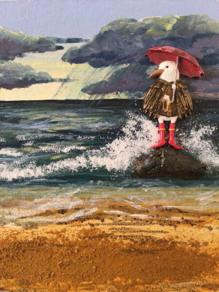 Мы создадим объемную мини-картину со стильной чайкой под зонтиком на фоне морского пейзажа.