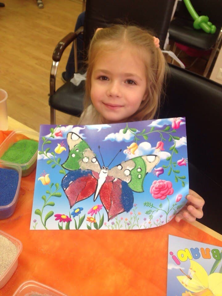 Поэтому даже самые маленькие участники мастер-класса с удовольствием возятся в цветном песке, и их маленькие ладошки также создают интересные картины, которые разумеется являются предметом особой гордости для их родителей